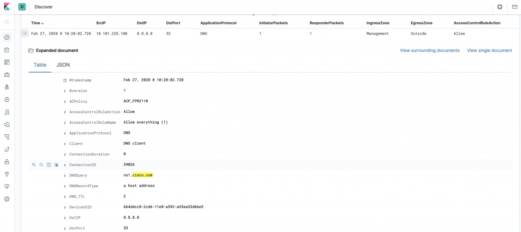 The Kibana interface is very customizable as to which data to represent. Below are my columns of choice, when using it for Connections logs and troubleshooting.