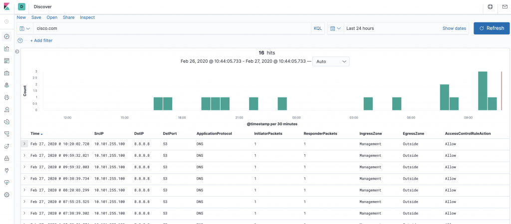 When drilling down with a search all fields are searched and the timeline bar at the top shows where there are hits in the database. In this example are given a search for “cisco.com” in all fields. We can see from the results that it is DNS queries which are being listed.